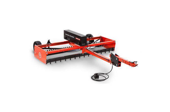 Our Widest and Fastest Power Grader! The 60" PRO with Powered Remote features the convenience of push-button adjustment of grading depth while you grade. The cabled remote control is operable from your tow vehicle so you can raise and lower the 14 grading teeth while you drive. You can start high, and lower the tines a bit with each pass.