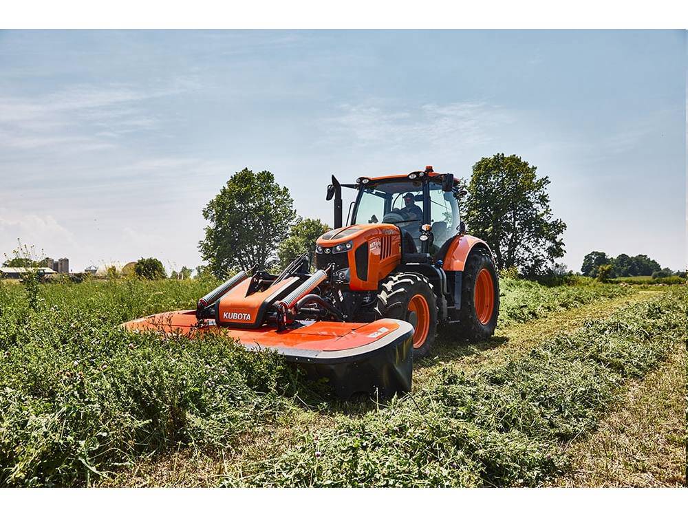 The Kubota DMC7332T Disc Mower Conditioner features eight counter-rotating discs, each equipped with three blades, to improve overlap and deliver perfect results. The heavy-duty cutter bar produces less noise and the disc mower conditioner’s suspension springs make for simple side-to-side adaptation. A cutting width of 10’ 5” gives the DMC7332T the range you need to make short work of your cutting, and the semi-swing conditioner minimizes wear and tear.