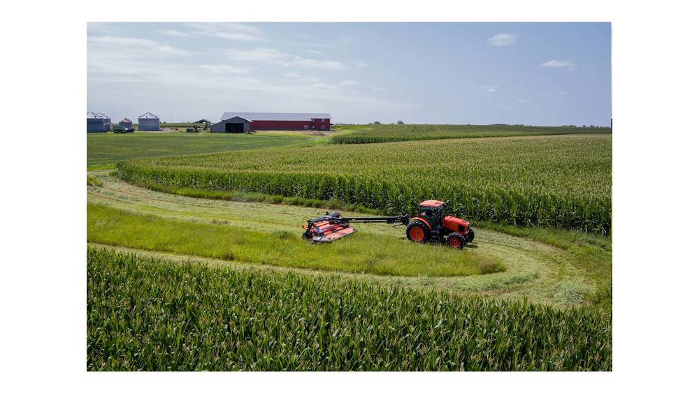- Kubota Suspension for Clean Cutting Action: The complete mowing section, including the conditioner, is suspended independently from the main chassis by either two or four long adjustable suspension springs, allowing field tracks and contours to be closely followed. If an obstacle is encountered in the field, the mowing section will lift up and backwards, protecting the cutterbar from damage. When the obstacle is passed, the mowing section automatically returns to the working position.